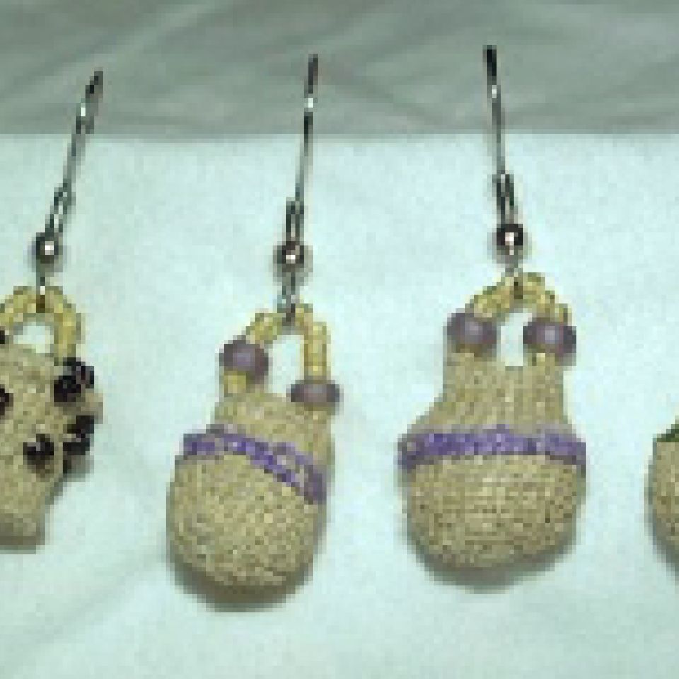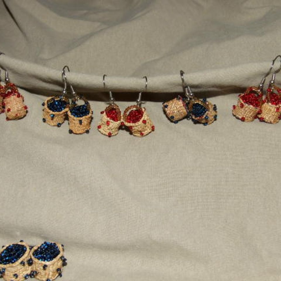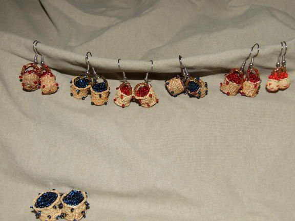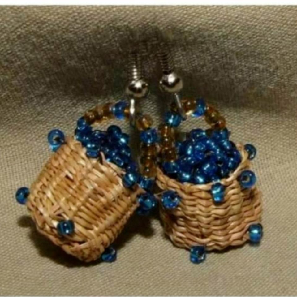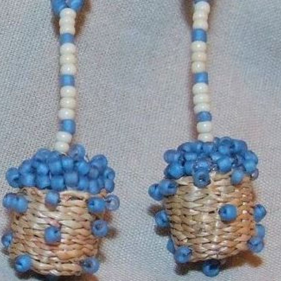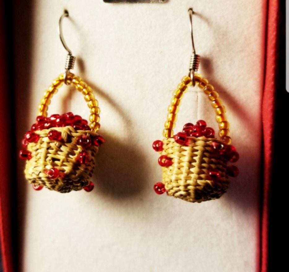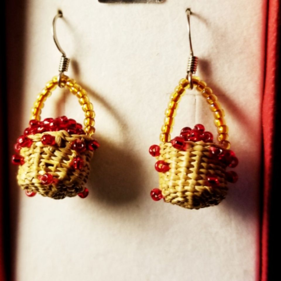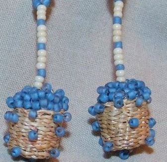 In the Alutiiq communities, berry picking was a task for women and children and done during the summer to fall months. Woven baskets and berries are the inspiration in Annie May’s artwork: woven baskets of beaded salmonberries and blueberries in necklaces, earrings and pins. When she was growing up in the village of Old Harbor, her father would take the family out on a sea boat to a berrypicking site and Annie May would join her mother and sisters in berry picking. Of course, her father had to stay nearby while he was collecting driftwood, to keep watch for another group interested in gathering the berries, the bears.