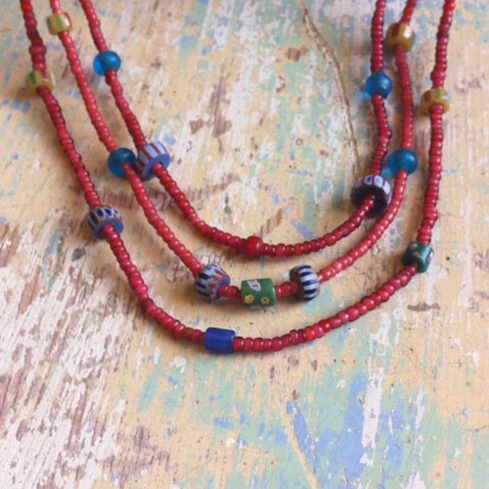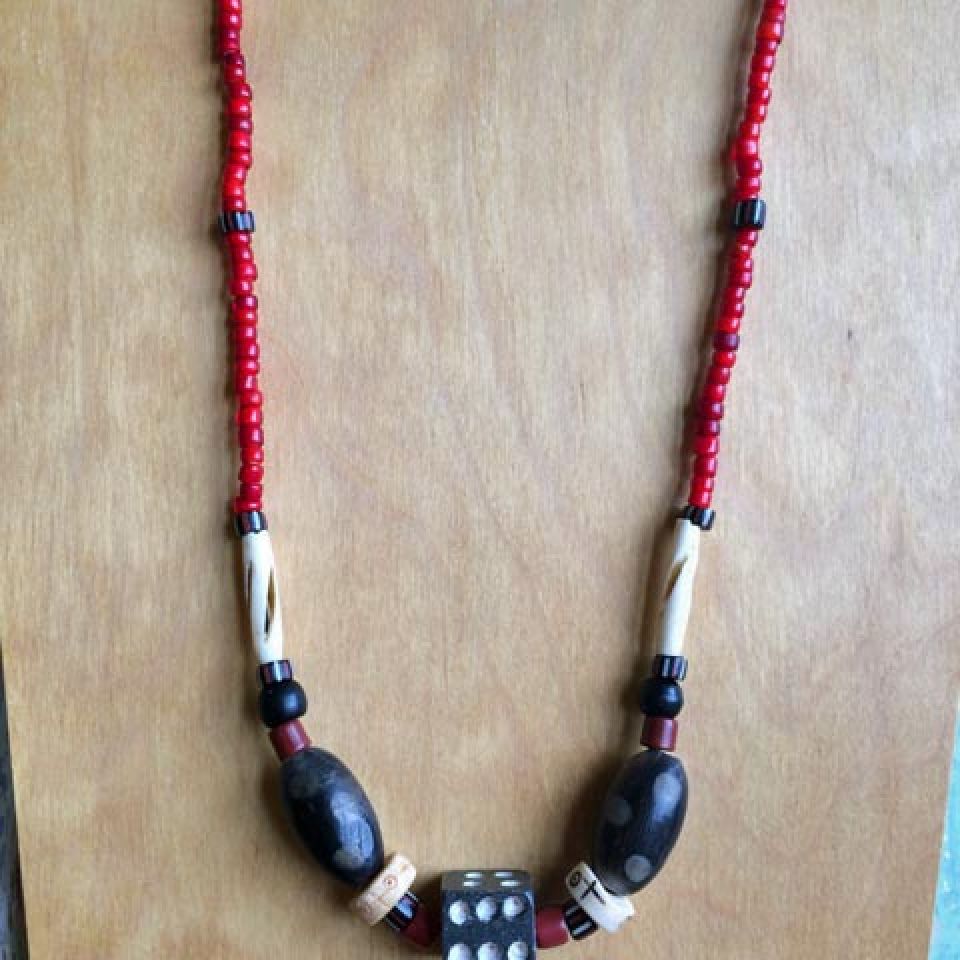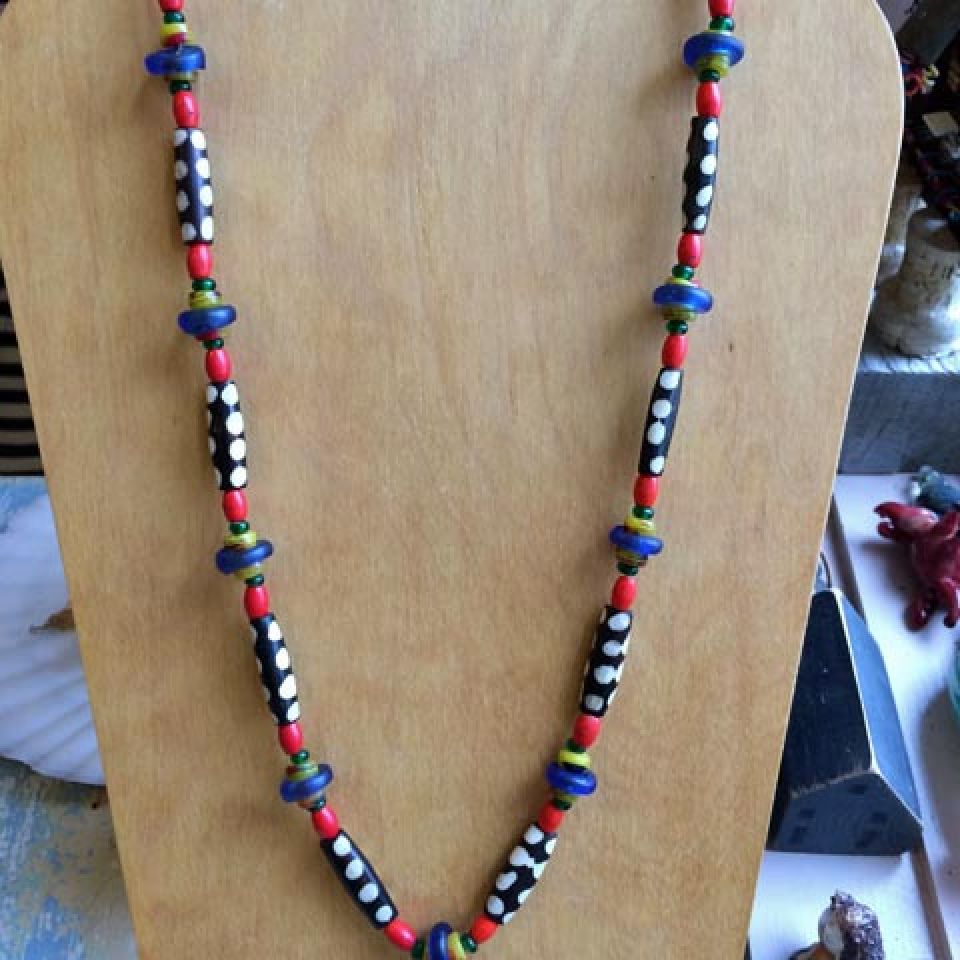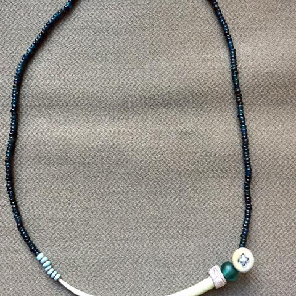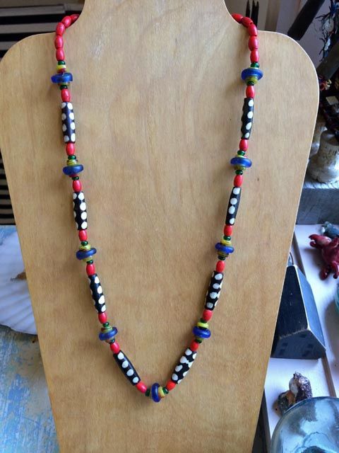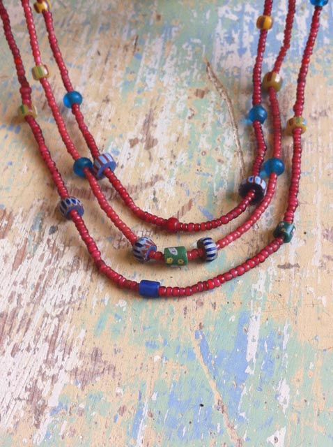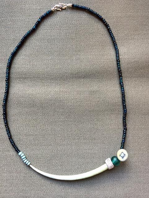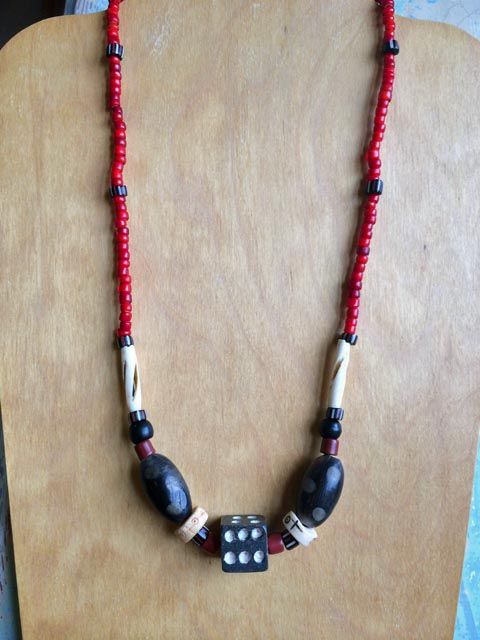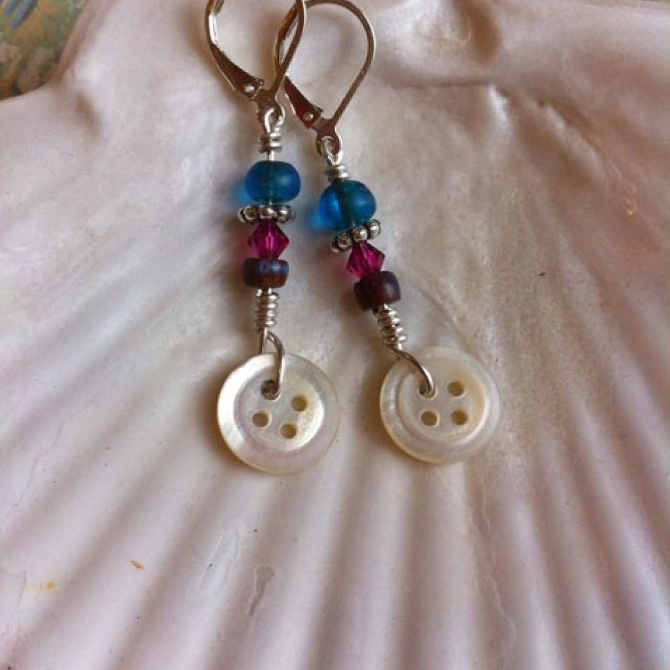 “I appreciate the old beads that have a history, were made by hand, traveled and been traded among cultures, and are each unique . . . I combine them with silver and sometimes vintage buttons or found items. I hope to reflect the world in my art.”