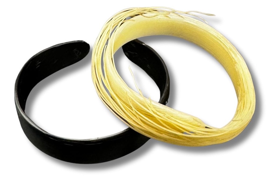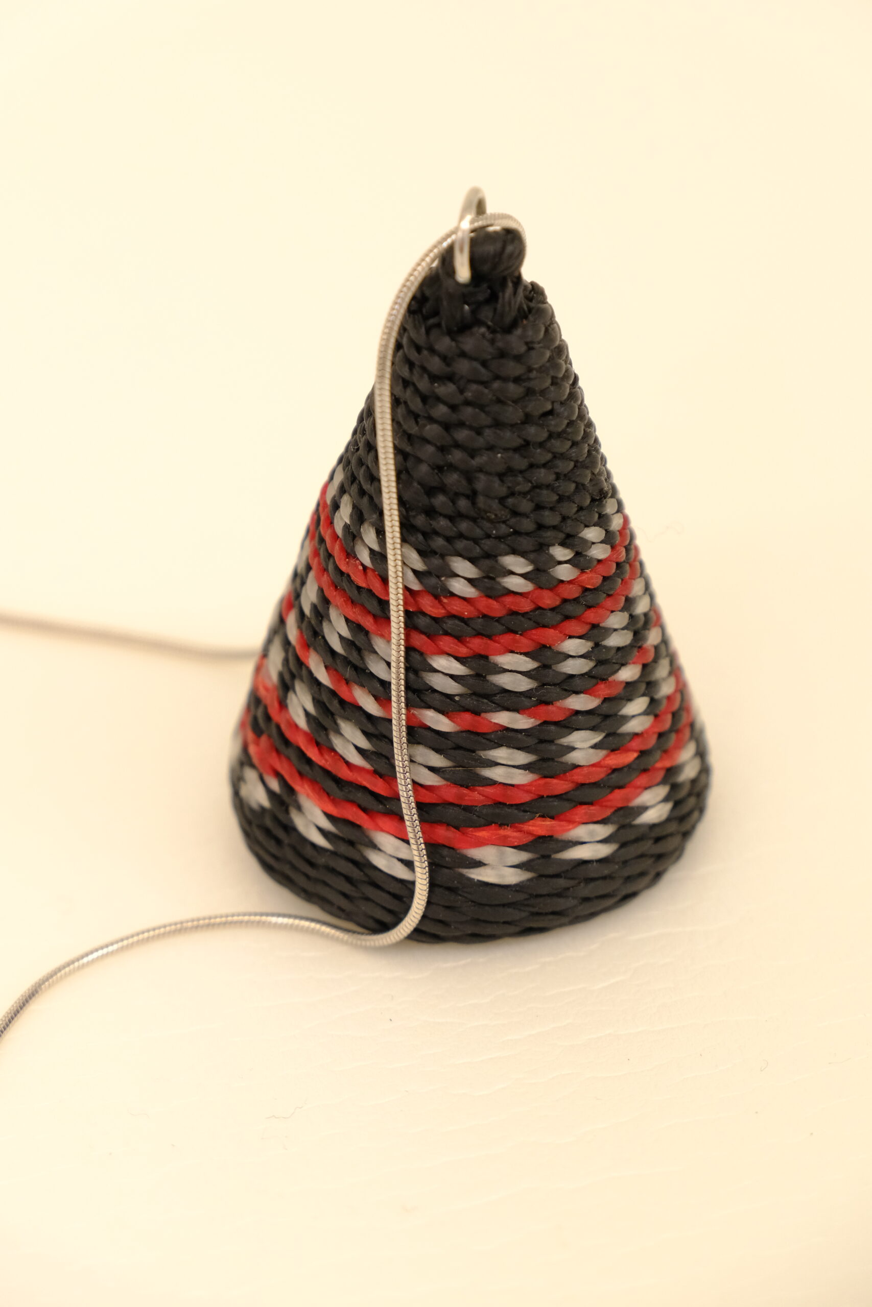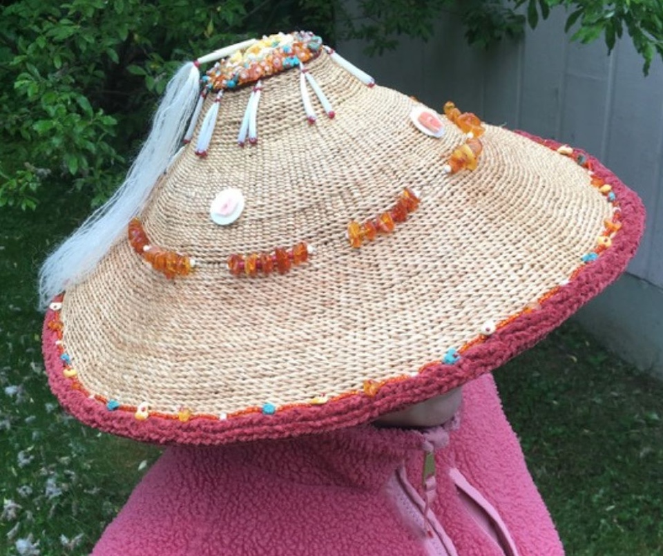Spruce root hat, by Arlene Skinner, 2022, spruce root, dentalium shell, amber, turquoise, and cotton yarn, 15″ x 17″ rim to rim, 8″ high. Purchased with support from Rasmuson Foundation.