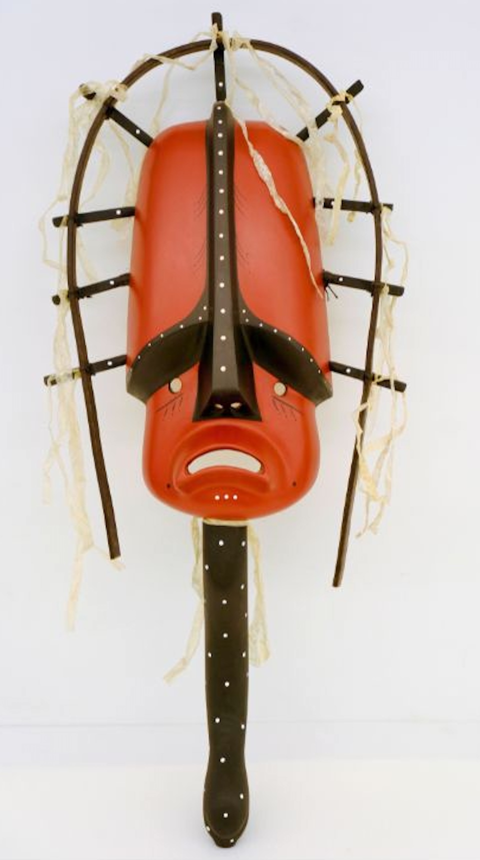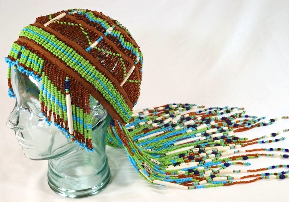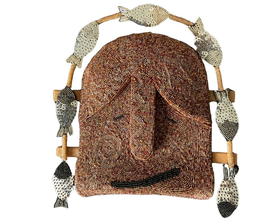 Beaded mask, by Cheryl Lacy, 2023, glass beads and sequins on a pellon fabric foundation, 12.5″ x 11.5″ x 1.5″. Purchased with support from Rasmuson Foundation.
