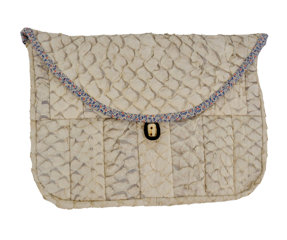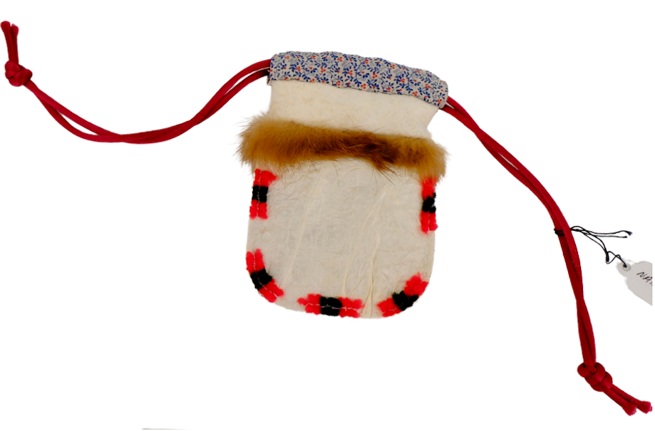 Gut Bag, seal gut with accents of marten fur, yarn, leather, and fabric, by Lalla Williams, 2011, 3 3/4” tall by 2 3/4” wide. Gift of the Ralph T. Coe Center for the Arts, 2025.