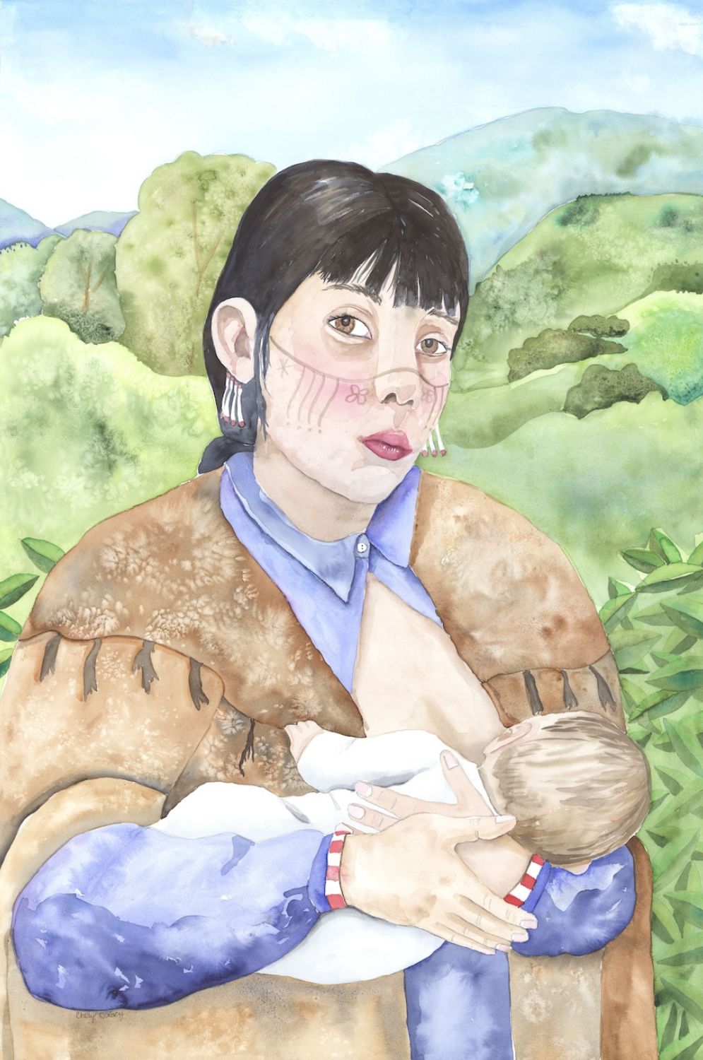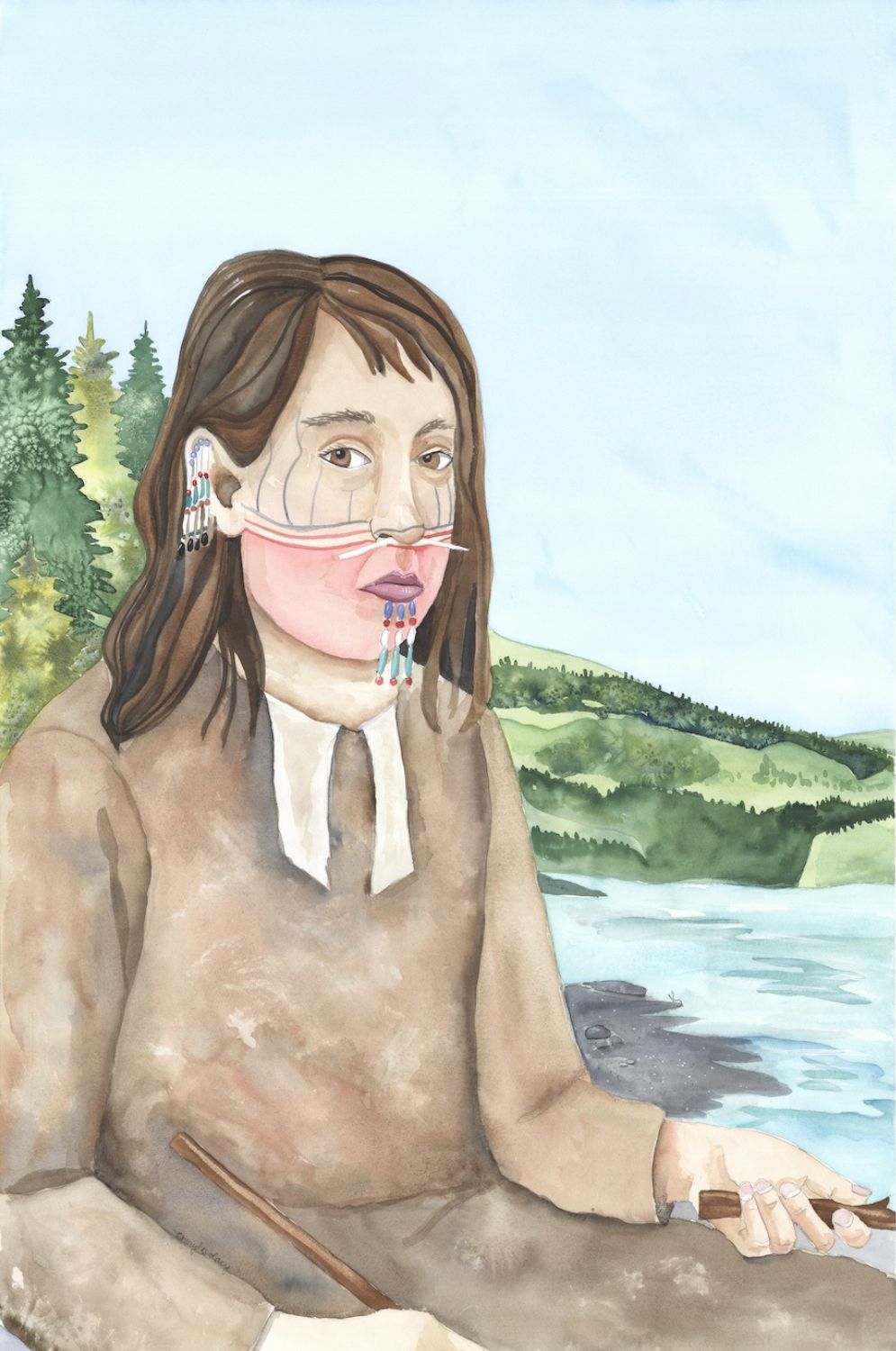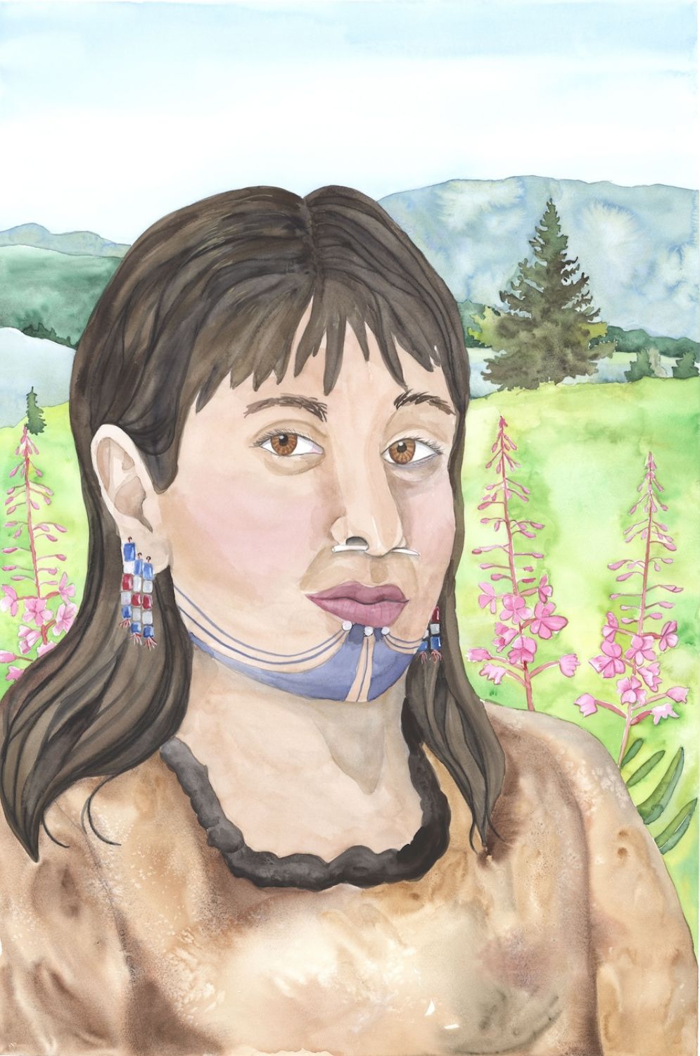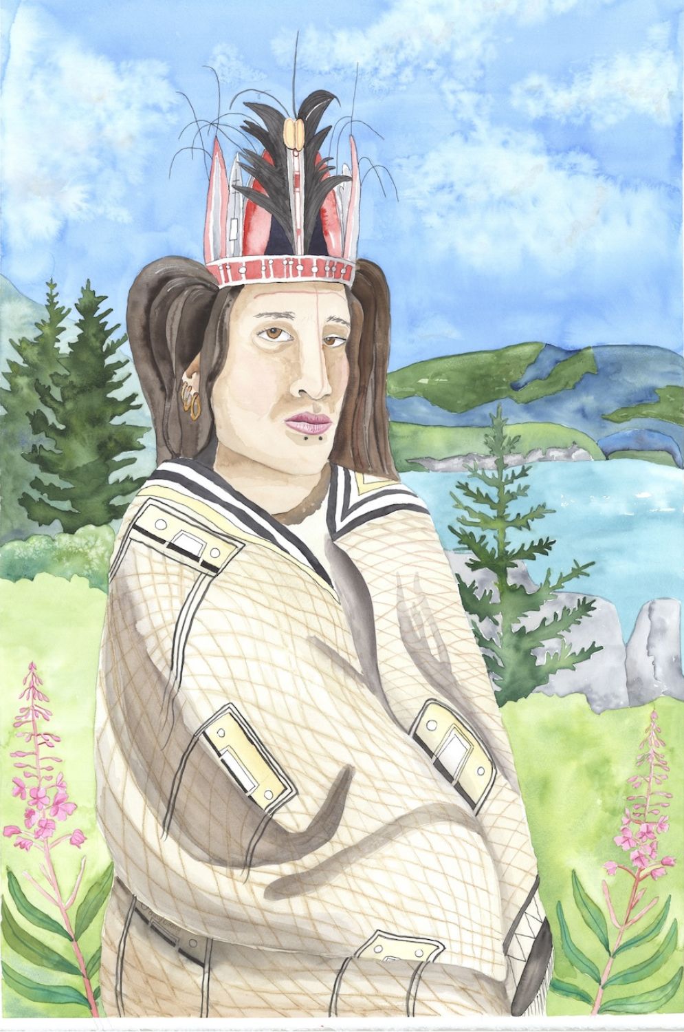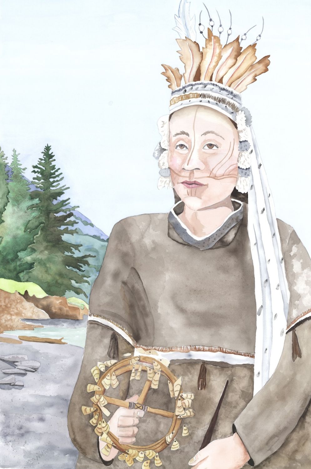To preserve ancestors’ faces and remove colonial perspectives, the Alutiiq Museum commissioned Sugpiaq artist Cheryl Lacy to create a new set of paintings. She restyled each of Tikhanov’s paintings into a single portrait. Then she placed Alutiiq people in their homeland with detailed backgrounds. Cheryl’s large canvases, bright colors, and living landscapes bring our relatives to life. They remind us that Alutiiq culture persists thanks to the strength of our ancestors.