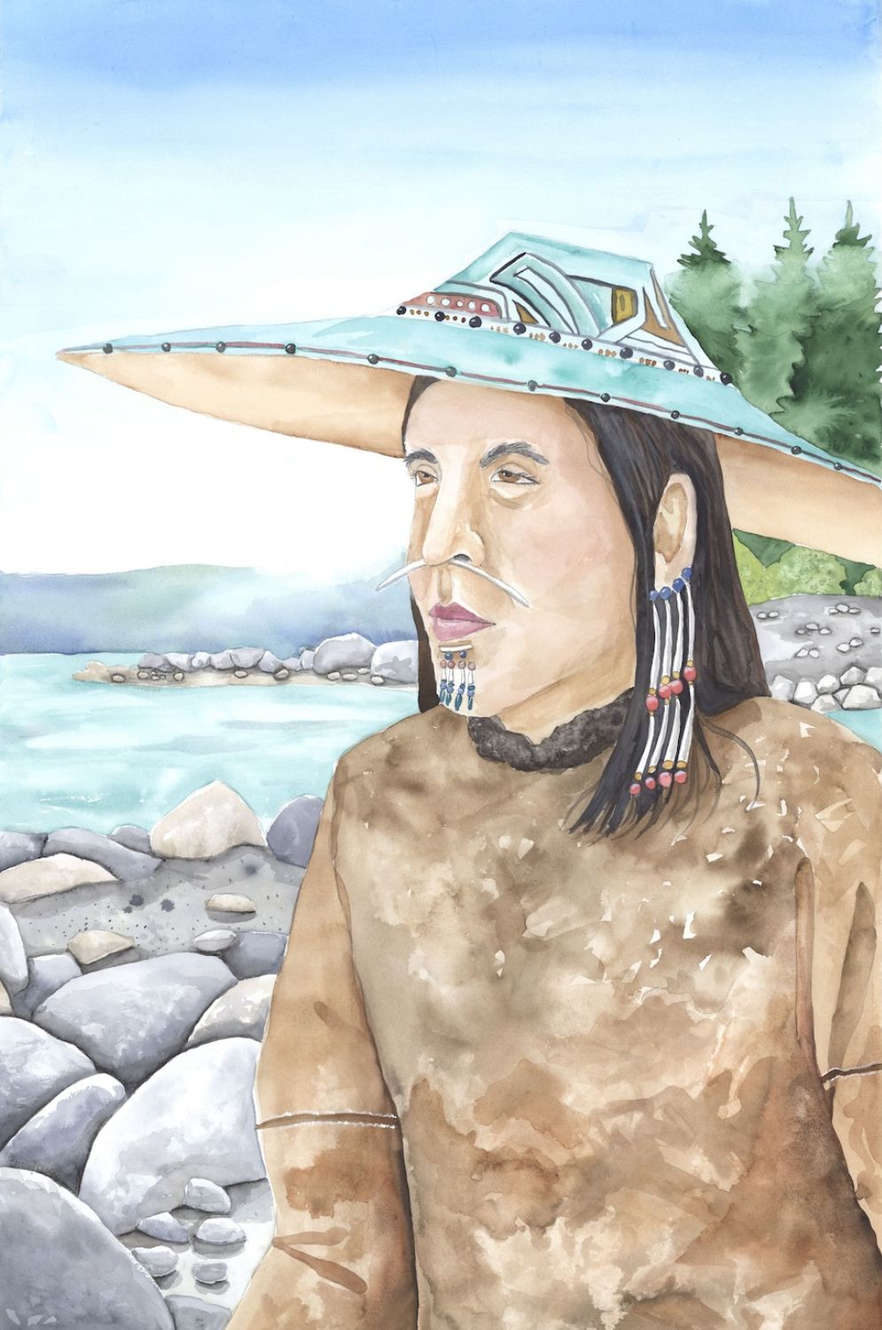 Tikhanov’s watercolors preserve the faces of Alutiiq ancestors and capture valuable details of Alutiiq life—clothing, tattoos, hairstyles, jewelry, implements, and names. However, the paintings also reflect the colonial era. Many show the same person from two perspectives—a front and side view—like a scientific specimen. The paintings also lack backgrounds. People appear on a blue canvas with few other details. The Tikhanov paintings can be seen in “The Alutiit/Sugpiat: A Catalog of the Collection of the Kunstkamera,” published by the Peter the Great Museum of Anthropology and Ethnography.