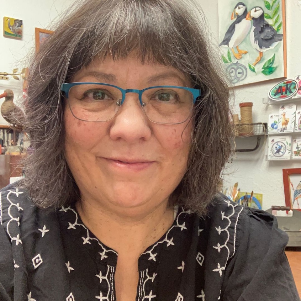A raven roosts in a patch of Nootka roses. A whale swims through misty waters. These are some of the colorful images that fill Cheryl Lacy’s canvases. Inspired by the beauty of Alaska and her Sugpiaq heritage, Cheryl is an avid illustrator, painter, and beader.