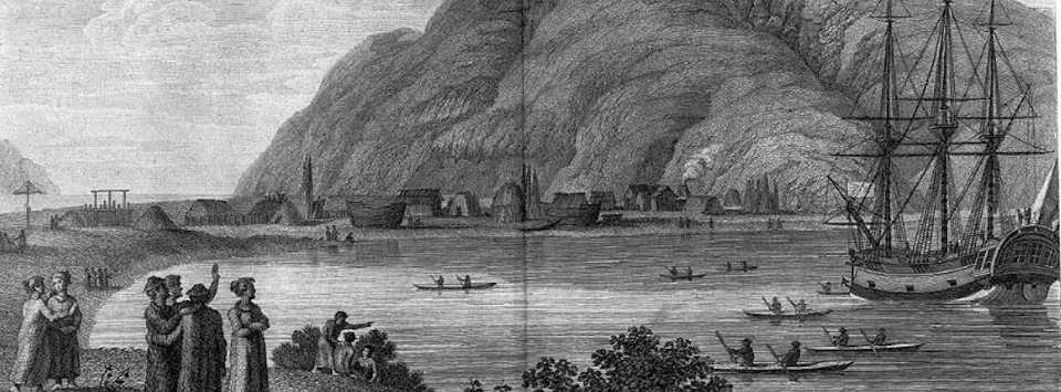 The Russian settlement of Three Saints Bay in 1791, lithograph from Gavril Sarychev’s Atlas.
