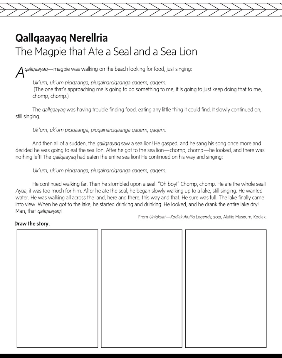 Our activity book is packed full of coloring pages, puzzles, crafts, games, and recipes inspired by Kodiak’s Native culture. Send a message with pictographs, play Alutiiq Word games, make paper dolls, create a tea party, and much more.