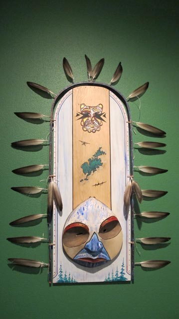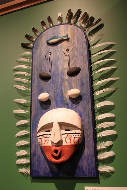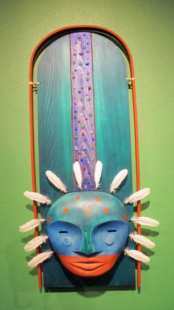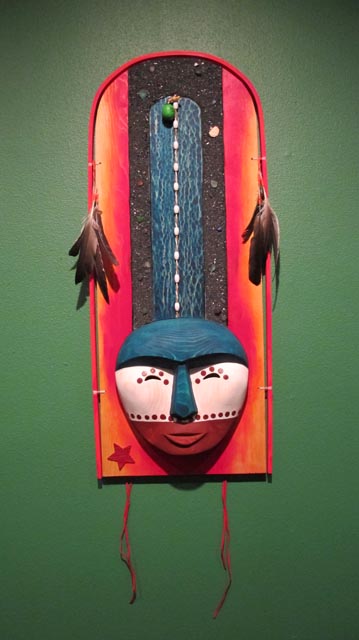 “To me my mask represents Afognak where I lived as a small child and today still return every year. To me it holds a strong presence of my ancestors and gives me a great sense of peace and pride of my culture. The green represents the beauty of the rich forest at Dig Afognak and the Old Village, the blue is the ocean and Litnik River. The beach glass represents one of my favorite things to do, walk the beach in the old village collecting it. The reddish brown color represents our rich land. All these colors to me represent the native people’s traditional and customary way of life.”