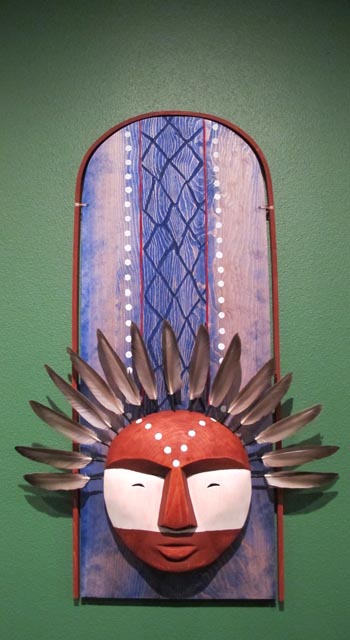“This contemporary plank mask titled Marriage Mask was created jointly to commemorate a new marriage. This mask is unfinished, when completed it will have the elements of paint and feathers to accent it.”
