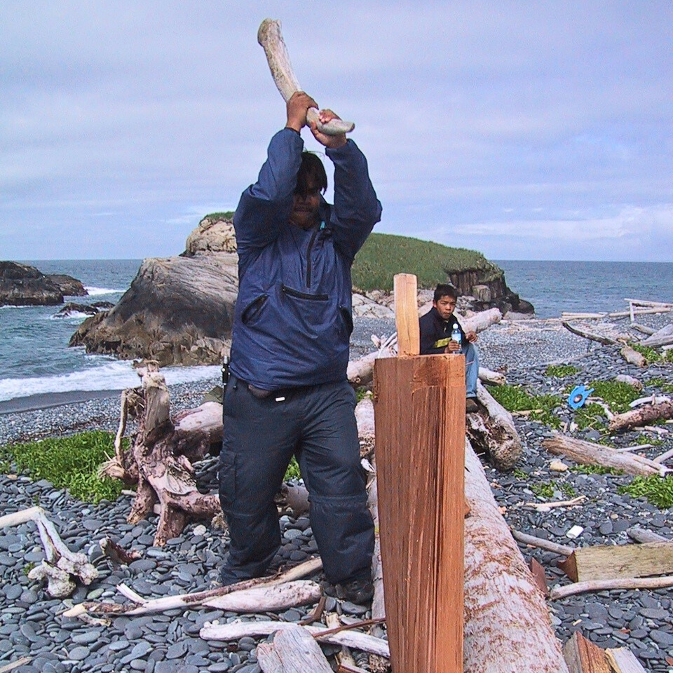 Artifacts reveal traditional carving techniques. Woodworkers split driftwood logs open with the help of resilient bone and wooden wedges, pounded with weighty granite mauls. They cut and shaped the resulting planks with a variety of stone adzes tied to flexible alder handles. Hand-held carving implements, wooden handles fitted with beaver, marmot, or porcupine incisors traded from the mainland, permitted finer carving. Carvers sanded the narrow gouges created by these tools with gritty abraders of pumice and sandstone and then applied finishing touches with a burnishing stone, a water-worn pebble rubbed over the carving to create a polished, splinter-free surface.