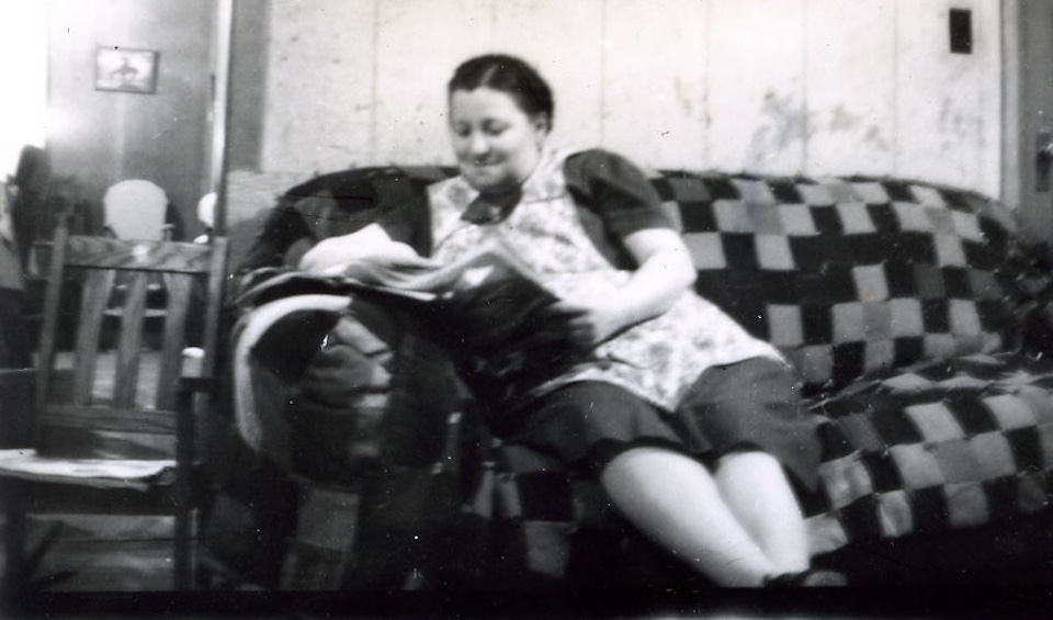 Mrs Setze reading, Ouzinkie, ca. 1950. Tim and Norman Smith Collection.